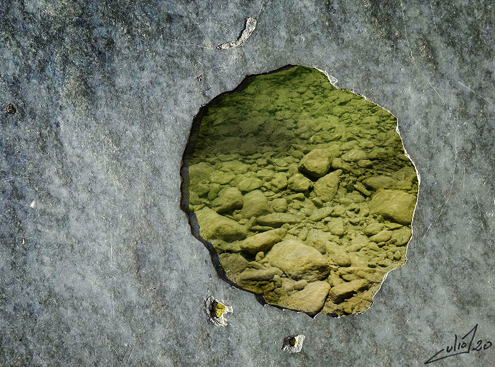 Un suelo, unos brillos, unas aberturas en un material blando, un cilindro, un suelo oscuro. Nada tenía relación. Pero la suma de todo… tampoco. Tal vez es lo que me llamó la atención. Que simulaba algo extraño sin saber por qué. Era un juego de líneas sin conexión aparente. Yo tampoco tenía conexión con todo ello.